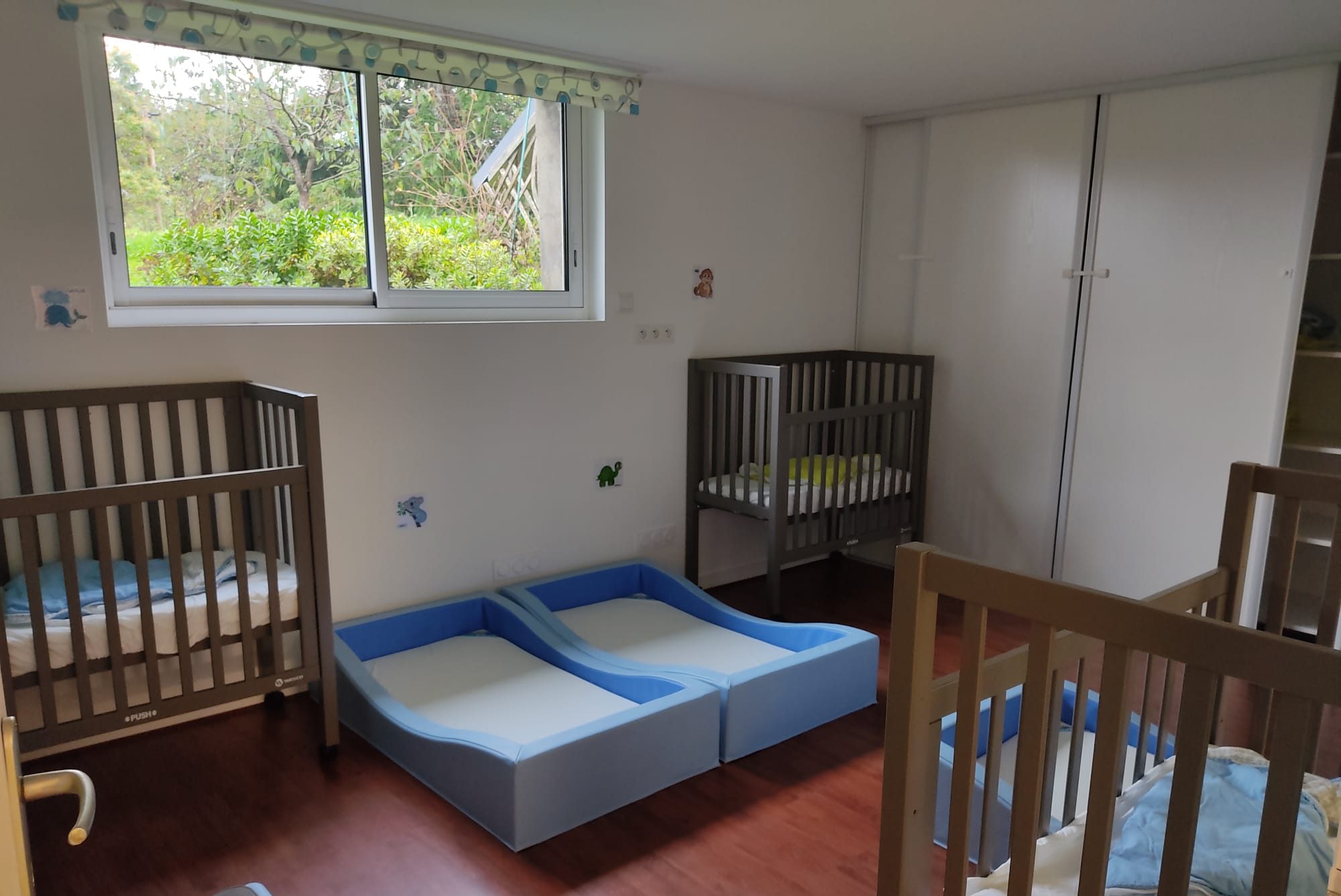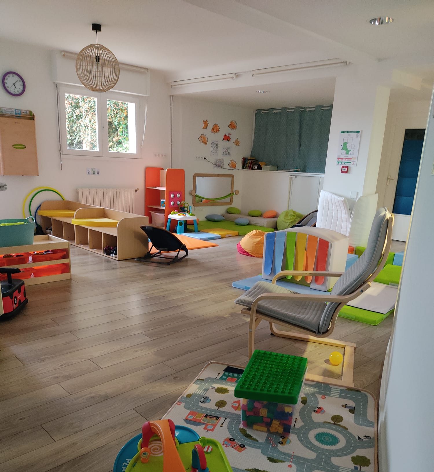 Des espaces dédiés à la lecture, à la motricité (un parcours de motricité en mousse pour pouvoir s’entraîner à devenir grand), aux jeux d’imitation(dînette, voiture…) et bien sûr un coin bébé…